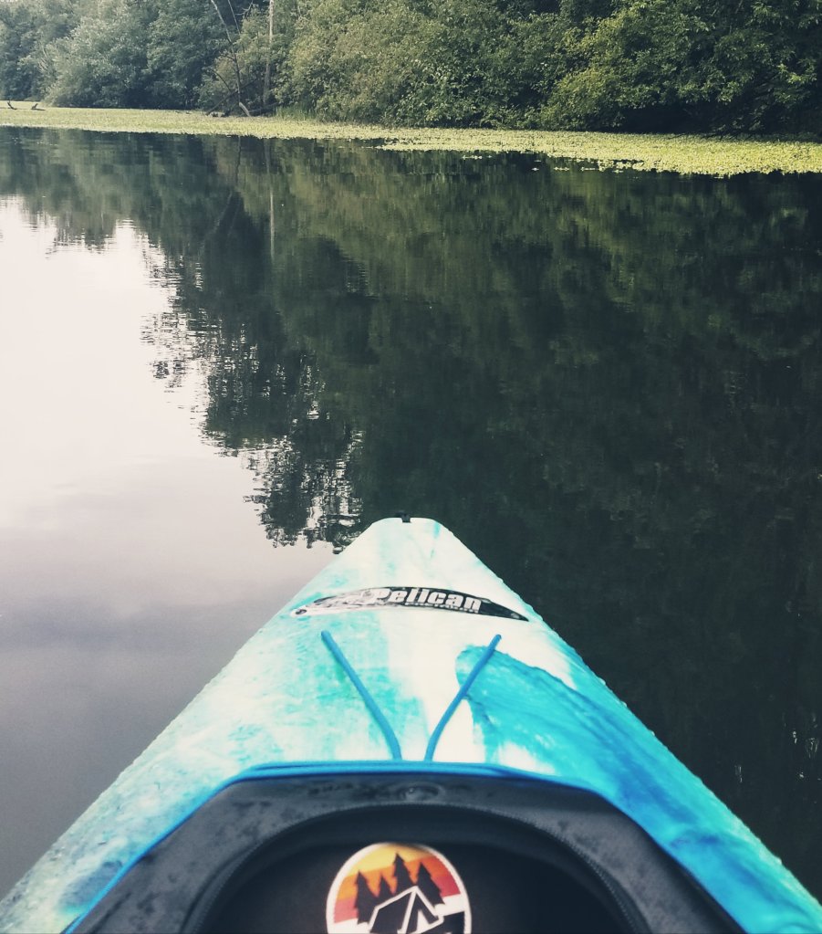 My finace was adamant that we take our kayaks out this morning, he had decided on it last night, and plans are plans, you know. That being said, I found my very grumpy self dragging my kayak into the small man-made lake near our home this morning, the rain pouring down across the water, the sky cloudy and grey. The very popular lake was completely deserted due to chance of thunder and lightning, and the dark clouds, aggressive rain and abundant wildlife was like being in a tropical rainforest. Lily pads floated by, frogs croaked, an eagle landed in a tree next to us and large blue herons stood idly on the bank until we got within feet of them, and they decided to fly away.